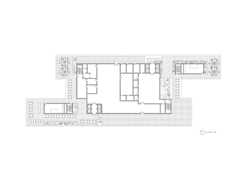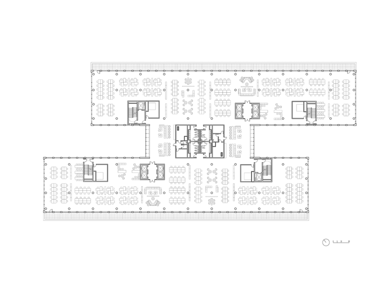 The innovative H-shaped plan offers several key advantages over a generic donut office building. Instead of a typical 45-foot span between the core and the walls, the building achieves 70-foot spans with three-sided window exposure. Distributing mechanical and circulation cores throughout the building created highly flexible floor plates that can be used by single tenants, two tenants, or adapted for a large quantity of multi-tenant configurations. Both wings of the H-shaped building feature their own circulation and mechanical cores, allowing them to be flexibly subdivided. Bridging the two wings is a shared central space that generates chance encounters between tenants and offers a place to socialize and collaborate informally.