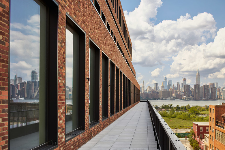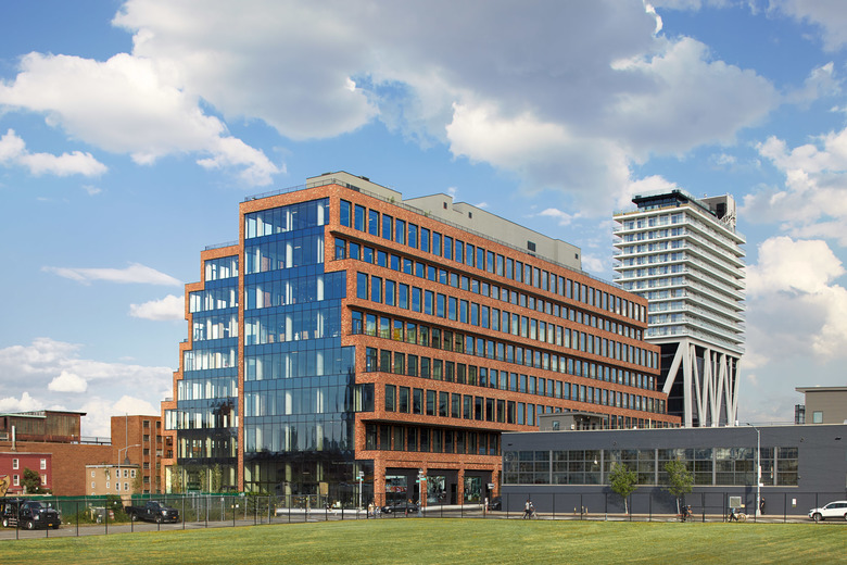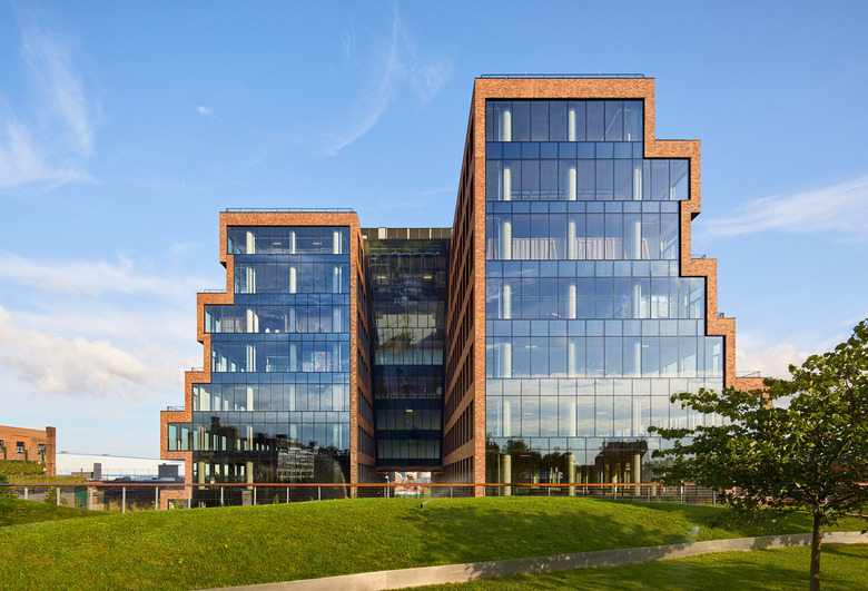Taking cues from the neighborhood’s industrial character, the design stacks a series of brick forms that nod to the materials and proportions of the nearby warehouses. The floors are staggered, creating a ziggurat-shaped building that juts in and out as it together in one collaborative workplace. The short ends of the facade are capped in soaring floor-to-ceiling windows that flood the interiors with sunlight and provide commanding views over Manhattan and Brooklyn.