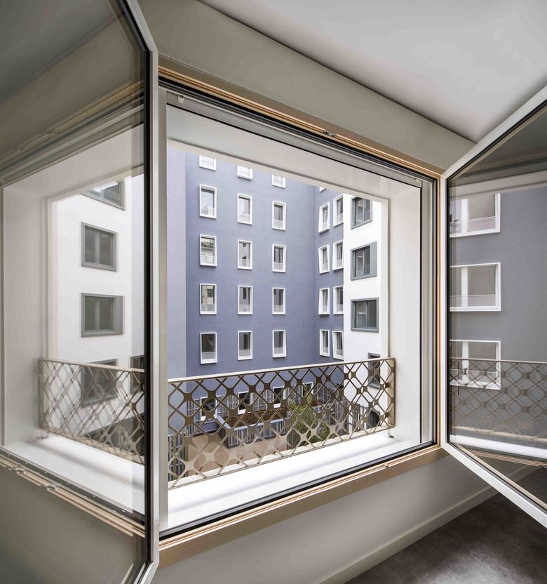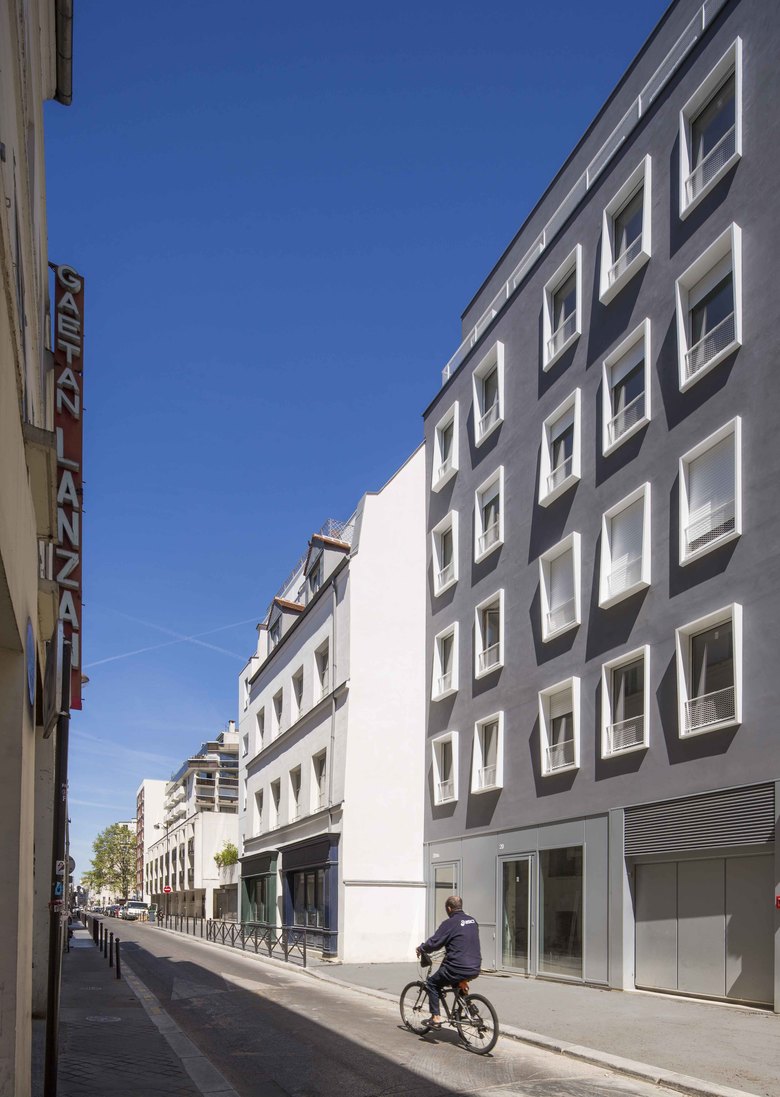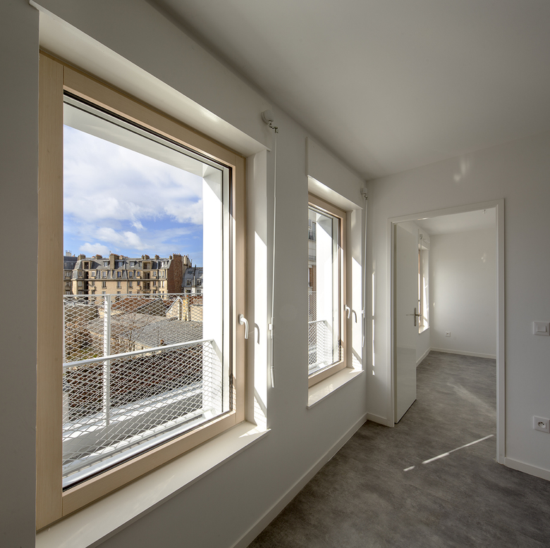 Side street the facade has three architectures, which does not suggest that this is a major housing project. This configuration allows, from an urban perspective, to restore the historic composition plot in the street, certainly more favourable to the preserved building. From an architectural and social standpoint that allows to break the scale of the large complex of housing to offer the scale of the Parisian building, more domestic.