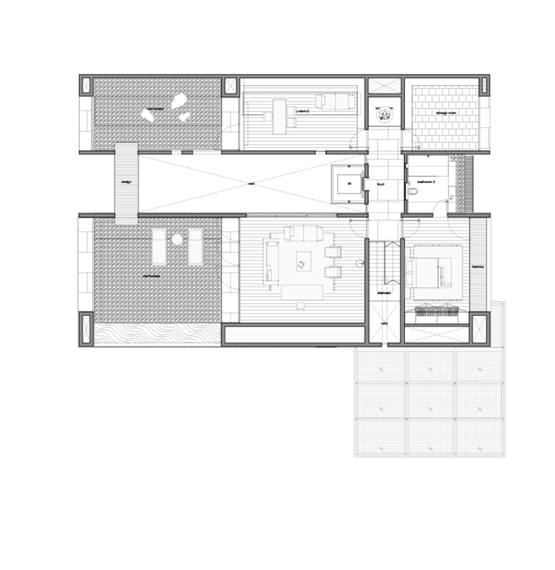 The master bedroom sits on the second floor of the main social volume, while in the attic floor above is an additional bedroom and number of multipurpose spaces. Adjoining terraces and open decks lined in artificial grass make the rooftop an interesting space where lines between indoor and outdoor space are blurred.