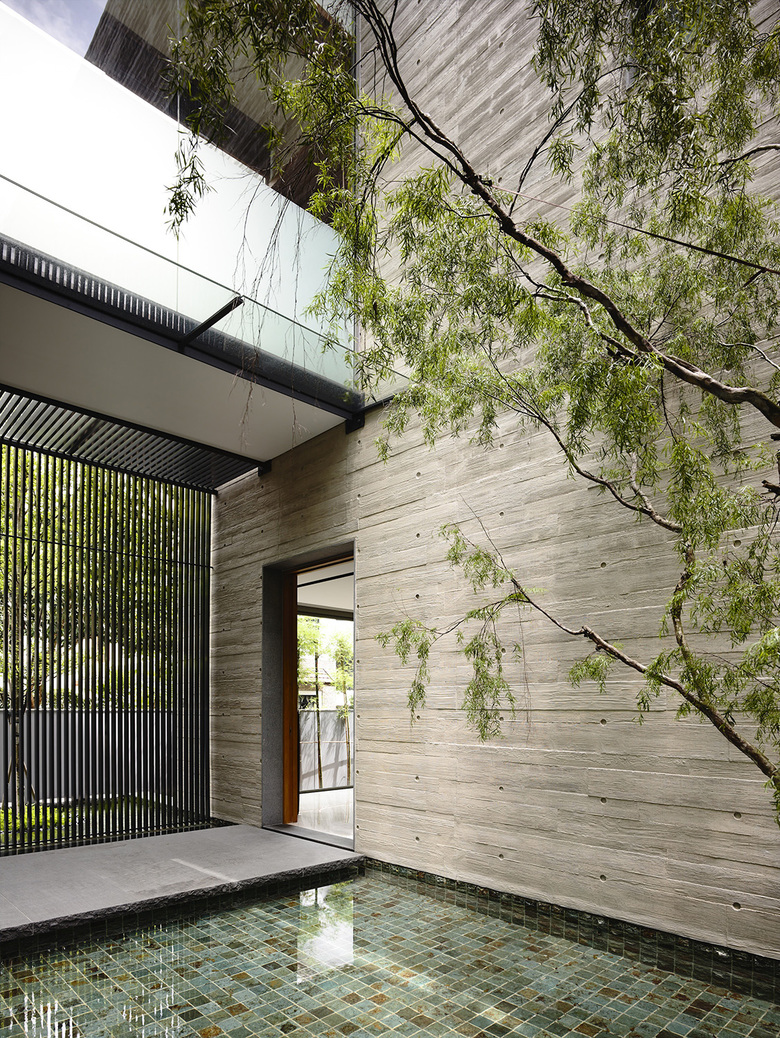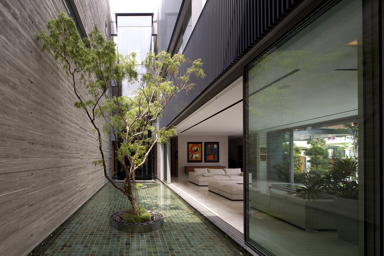 The space between the two volumes is open to the sky and is occupied by a reflective pool, making it the attractive central focal point of the house. The three-meter-wide void is prominent as the central focal point because it contrasts with the three-story-high volumes that look visually heavy. It offers qualities of light and spaciousness as opposed to the solid volumes, which are set against the floor.  Trees in the reflective pool add softness to contrast with the solid volumes. This void ensures cross-ventilation in all the spaces because it pulls the air up through it, so hot air goes up and cool air goes down into the various rooms, making internal circulation efficient.