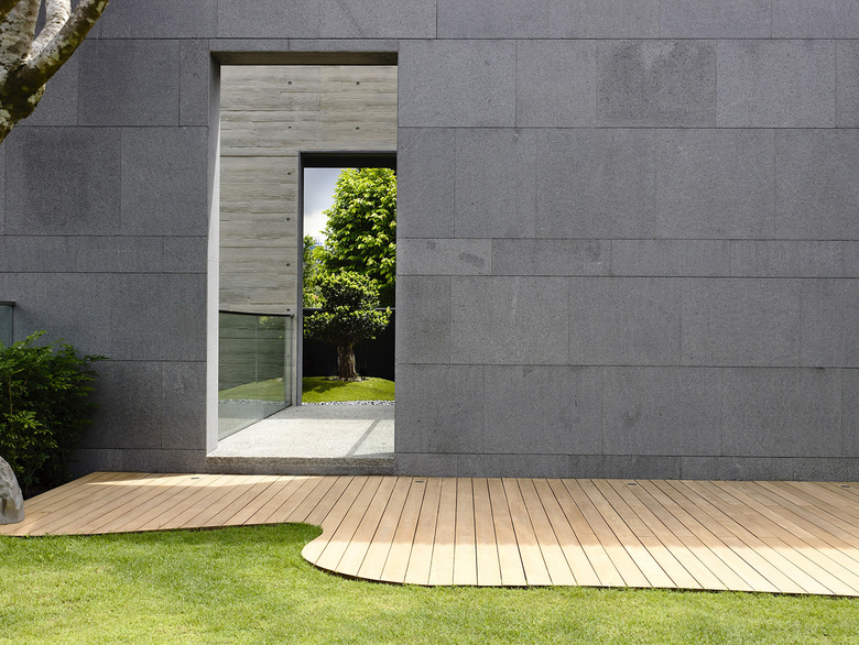 The two volumes are divided into two materials – the service volume uses fare-faced concrete texture with the concrete's natural color. The front volume that contains social spaces like the living, dining, master bedroom are clad in stone granite. Both the granite cladding and concrete keep the house cool inside.