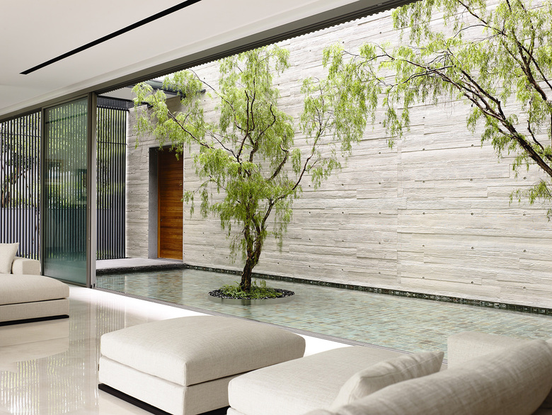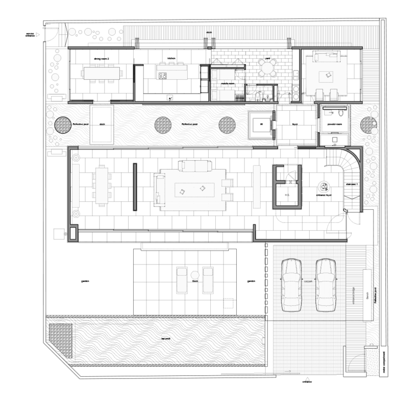 The full-height glass panel doors that line the two lengths of the front block can be pulled back, allowing all spaces on the ground to flow into each other seamlessly, while maximizing views of the garden and pools.