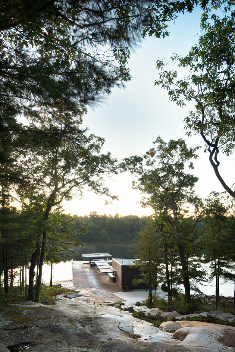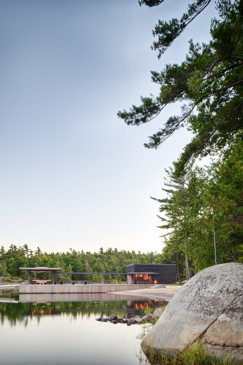 As the dock extends out far into a small bay, it sits under the cover of the pavilion and blends into the surrounding panorama of smooth granite, still water, and commanding jack pines. The landscape remains the dominant experience.