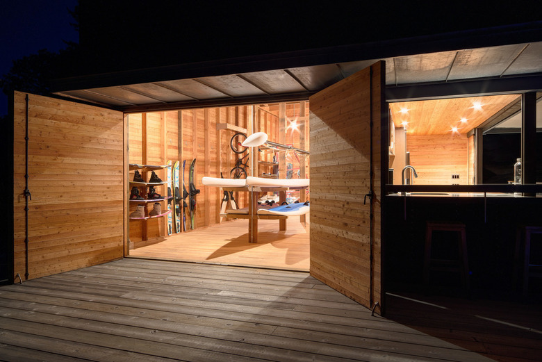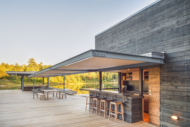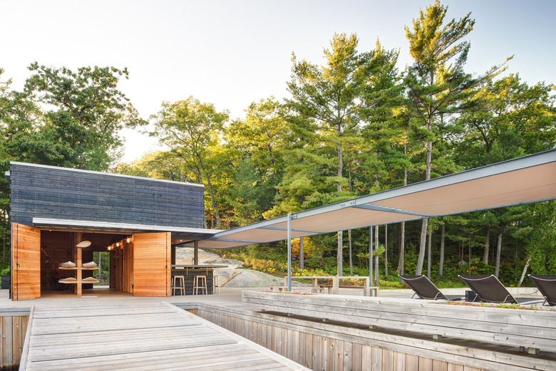 Sitting on a structure of robust timber and rock cribs, the large cedar dock, and its amenities, is the primary location of the family’s daytime leisure activities - both active and reposed. The building elements consists of the cedar dock, floating docks and bridges, a storage building for kayaks, canoes and windsurfing equipment, a food servery, linear shade canopies, and a covered seating pavilion.