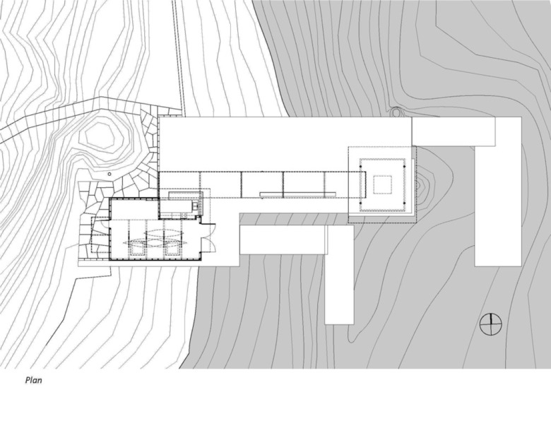 The storage building is clad with black stained resawn cedar, while the steel pavilion structure is covered with cedar and terne coated copper. The two are connected with a light, steel, and canvas linear shade canopy structure. On approach, due to its thinness, lightness and horizontality, the finely crafted ensemble almost disappears as it recedes into the landscape. In the evening, gentle up-lighting of the pavilion provides a warm beacon for late arriving guests.