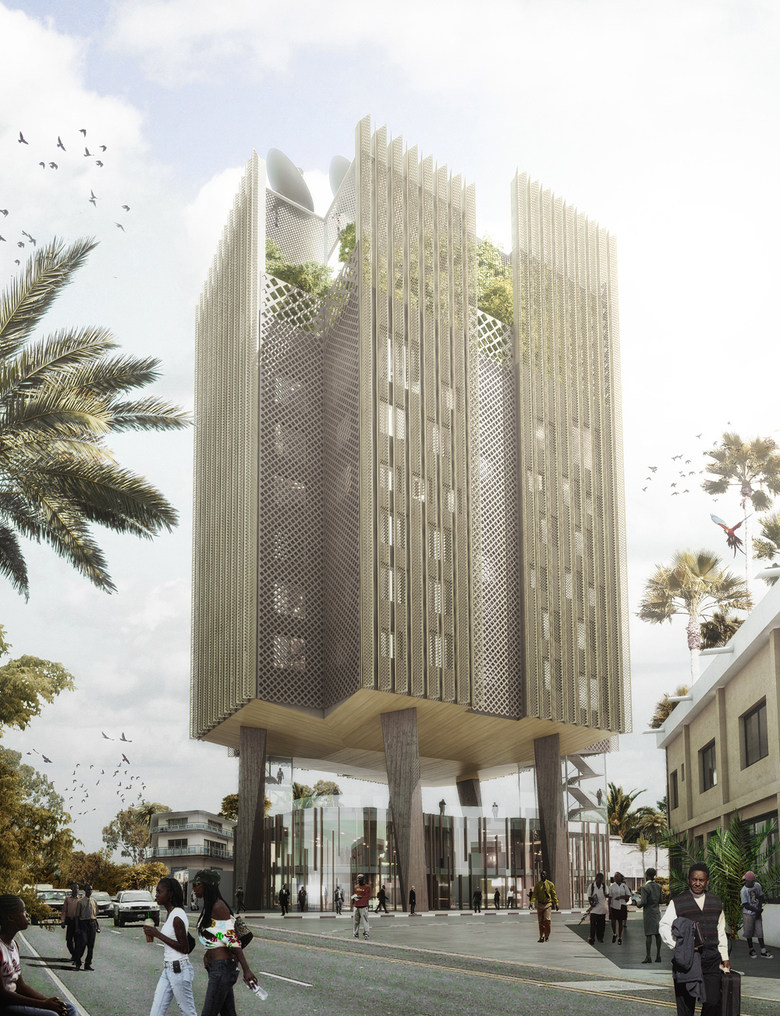 Mikou Design Studio's competition entry for the Africanews radio headquarters includes news rooms, meeting rooms, offices, congress hall and panoramic restaurant.