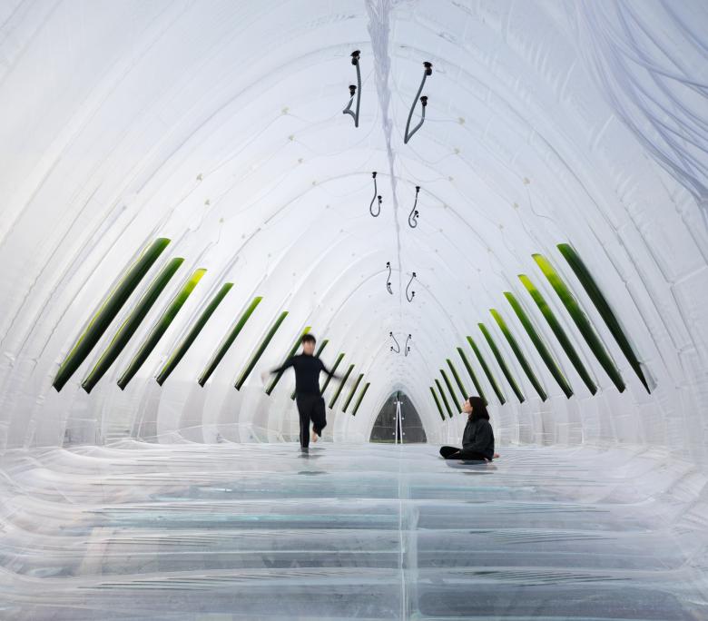 The project encourages visitors, and especially children, to directly interact and experience the air cleaning capabilities of micro algae cultures, while immersing themselves into a bubble of freshly metabolized oxygen. The playful softness of the organic structure, akin to a gigantic bouncy jellyfish, is a direct manifestation of the biotechnology it integrates.