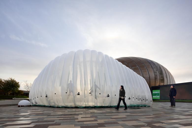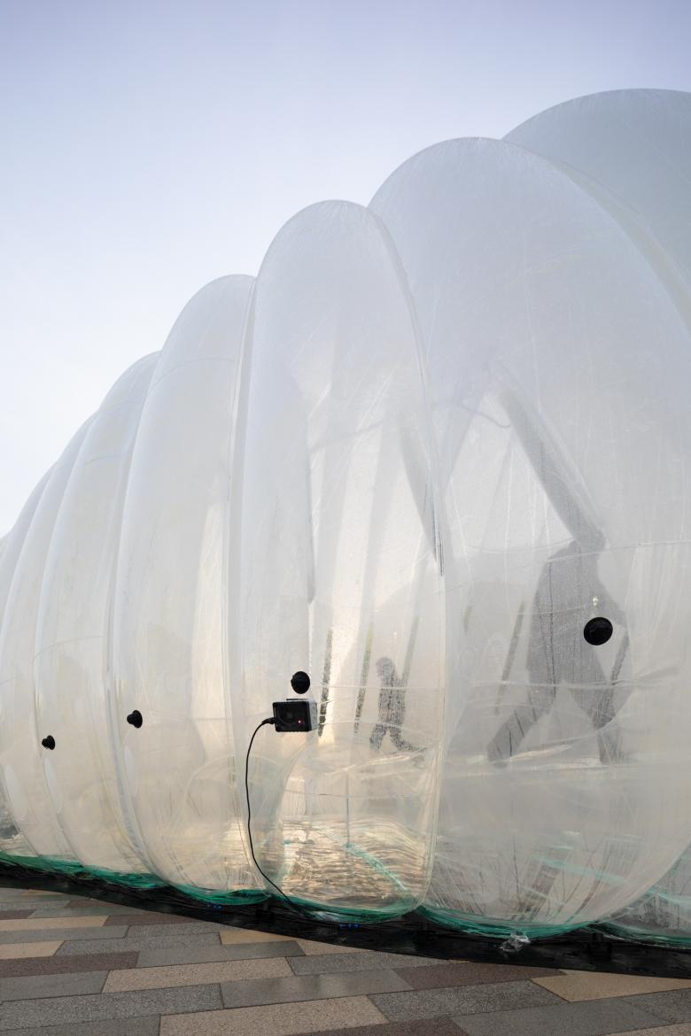 The filtering process is further enhanced by the architectural morphology of the structure. The TPU membrane – an evolution of the PhotoSynthetica urban curtain system presented in Dublin in 2018 by ecoLogicStudio – controls the microclimate inside the bubble. The inflatable membrane’s doors stimulate air recirculation and natural ventilation.