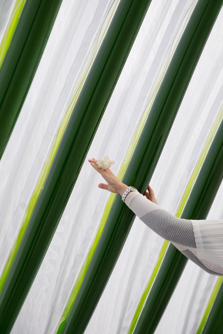 The eco-machine is made of 99% air, water and living photosynthetic air-purifying Chlorella cultures. This new bio-digital project demonstrates how the advanced integration of biotechnology in the built environment can lead to a new generation of living, growing architectures, where beauty and efficient ecological performance are combined.