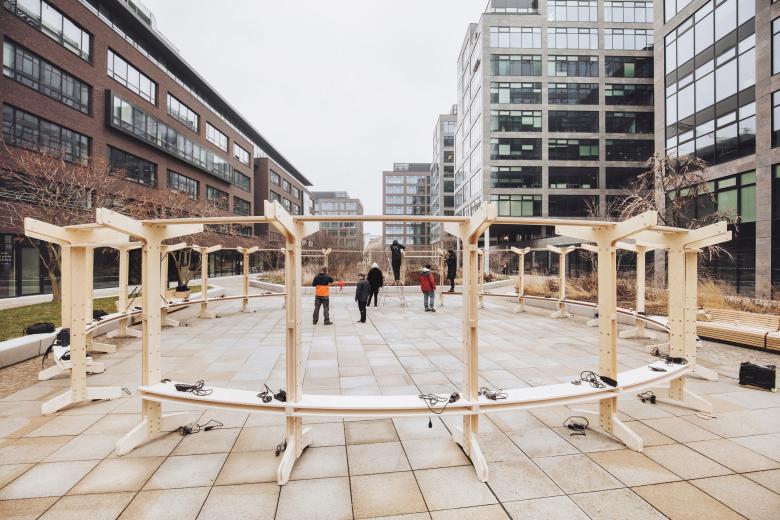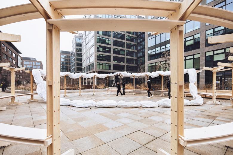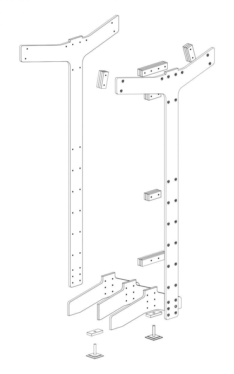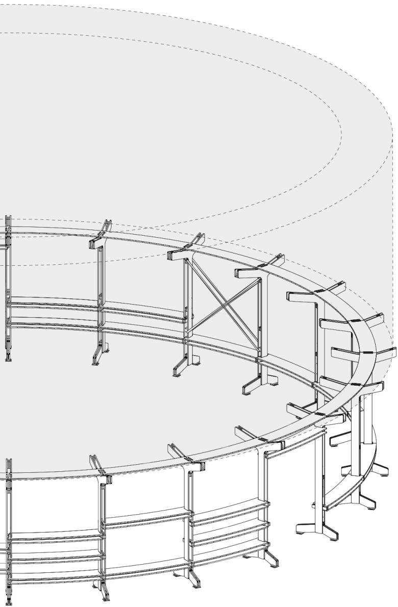 Modular, Durable, Reusable: Made of CNC cut plywood planks with minimum waste in cut-outs, the foundation is designed as a modular system composed of vertical legs and horizontal benches. Components are bolted together to form a circular load bearing structure providing stability to the body.