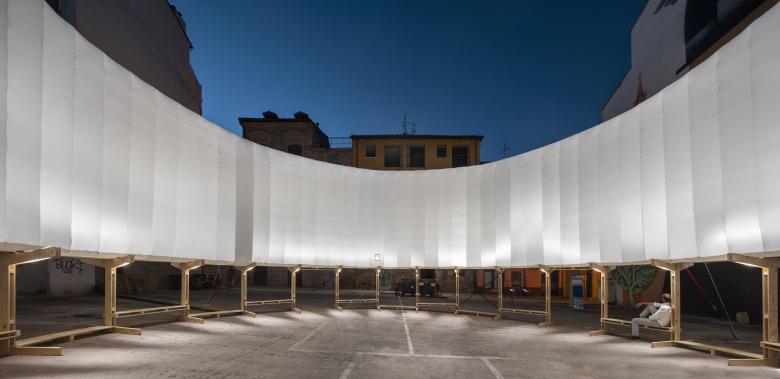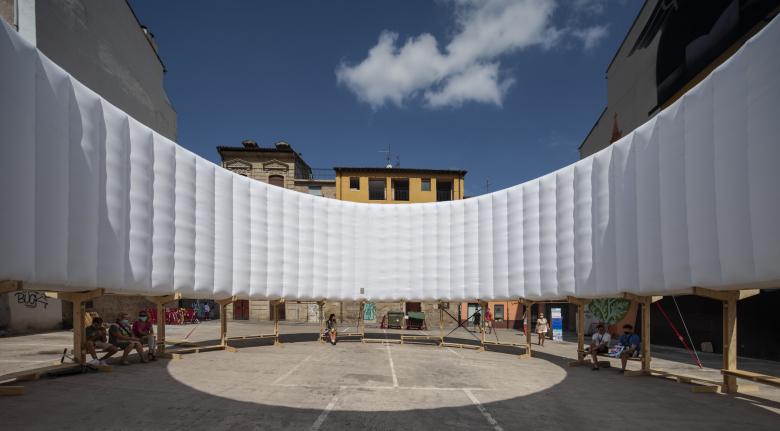 Air Square is a transportable venue that activates underused urban spaces by bringing them purpose and a vibrant public life. It responds to the need to alleviate climate change issues by tackling overexposed heat islands and lack of green and livable public spaces. The upper ring is designed as a large shading system that mitigates, cools, and delivers refuge from heat. At night it provides illumination to dark and less safe urban corners.