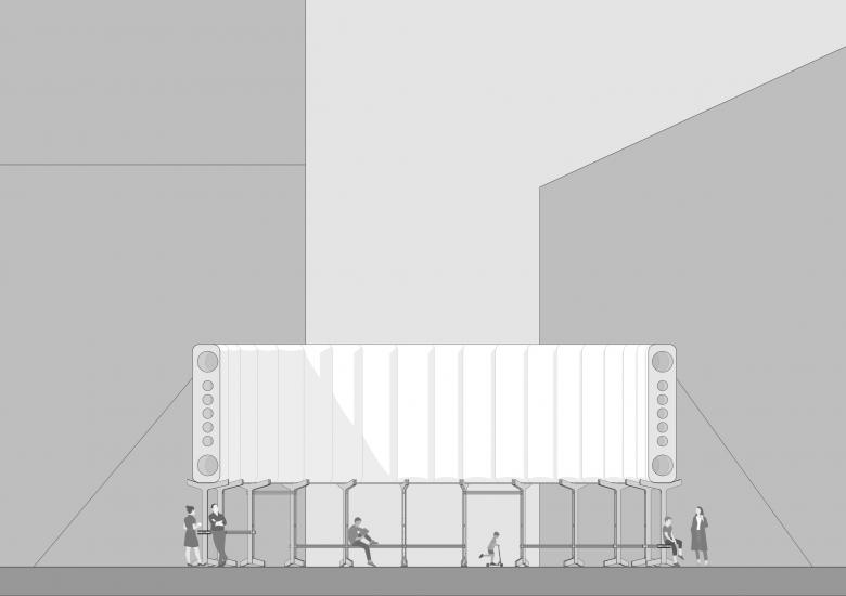 The upper ring is designed as a shading system for public spaces. In response to the issue of overheating cities around the globe, the ring generates a large surface to hide from the sun, cooling down urban areas. The vertical and open shader avoids issues related with having a roof (underblow, heat accumulation, structural issues), and in order to create a large urban surface to shade, a light material was used that can be easy to build and unbuild, its light, it can resist strong weather conditions. Also, the circular shape allows for a bigger reach of shading compared to a straight wall, making it a sun-protected space. Through the dark hours the inflatable switches function and become a light diffuser, providing illumination to dark areas of the city which often feel unsafe to walk through. This generates a sense of care and belonging to the space, leading to improved security on the location.
