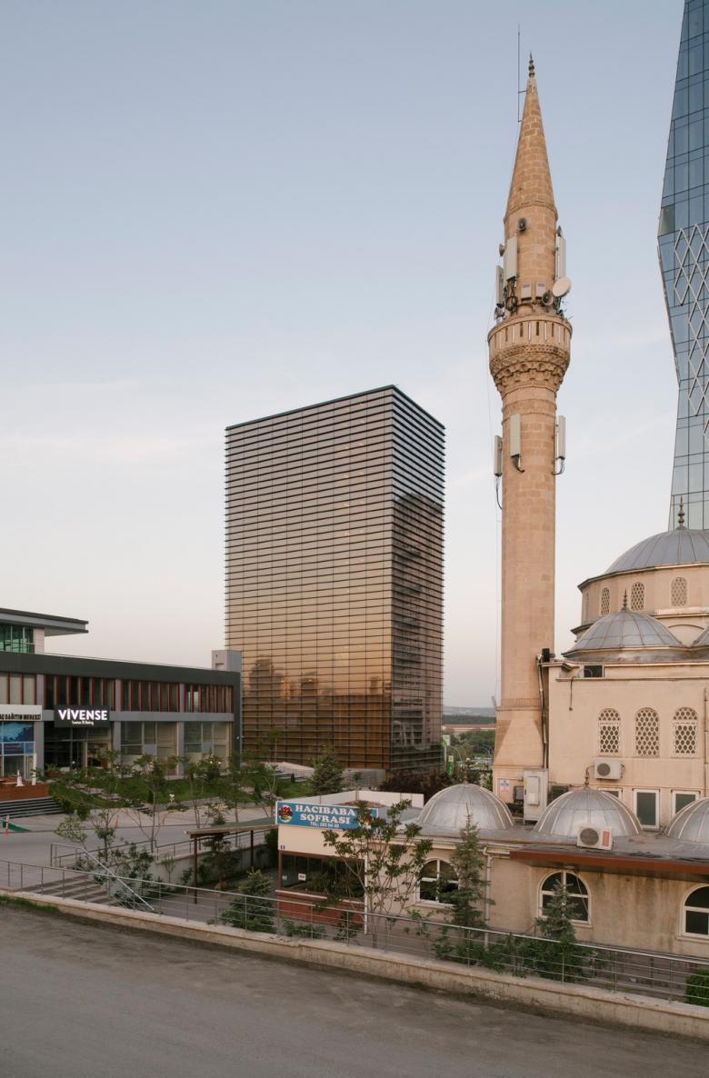 Urbanistically, the project plays an important role in a rapidly developing area west of Ankara’s old city center, knitting together a transit corridor, a pedestrian underpass, an emerging mixed-use neighborhood, and new commercial areas. In response to this immediate context, the building is set back from the highway, making space for a bamboo grove that buffers a habitable urban garden and provides a much-needed pedestrian connection between the transportation node and the adjacent neighborhood. The tower itself is distinguished by clarity of expression: a simple, geometric glass volume encasing a stack of large scale, horizontal louvers, set in a lush landscape.