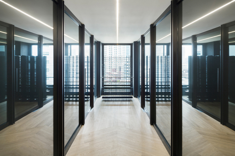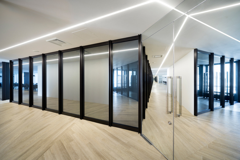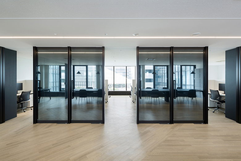 Firstly, the interior layout has been designed to fit in with the L-shaped lines of flow and diagonal shafts to as great an extent as possible, and the exterior curtain wall has also been replicated indoors. As the original aluminium window frames were special-ordered and their