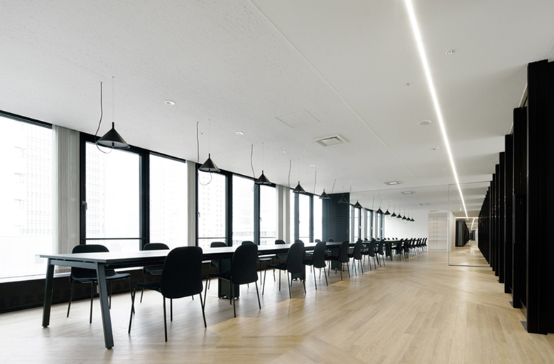 We experimented widely with a variety of IR reflecting and paints in order to precisely recreate the colouring of the original half-mirrored exterior and sashes. And in order to accentuate the reflection of the half-mirror, the flooring material has been fitted symmetrically in relation to the curtain wall. The result is an interior design that allows one to get a strong sense of the character and form of the building as a whole.