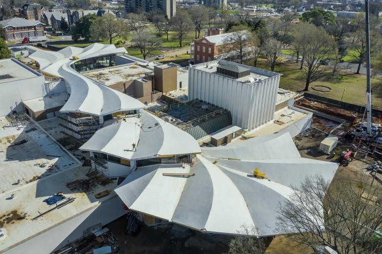 Included in our roundup of "a dozen buildings opening in 2022," the Arkansas Museum of Fine Arts is shown here in construction photos taken by Timothy Hursley in March 2021.