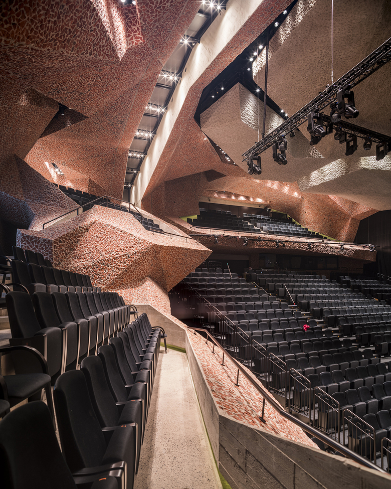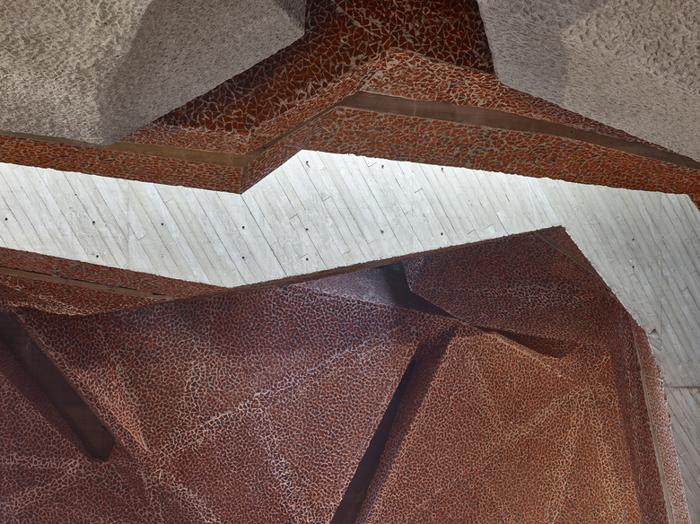 The picado (chooping) is all over. It is an innovative technique, based on an original idea by Fernando Menis, consisting of mixing concrete with other materials and breaking it afterwards. In addition to achieving a strong expression, the picado helps achieving excellent acoustics. The first time Menis used the picado was for Magma Art and Congress (Tenerife, Canary Islands, 2005). This new technique has been certified by the Institute of Building Research from Spain and Poland, respectively.