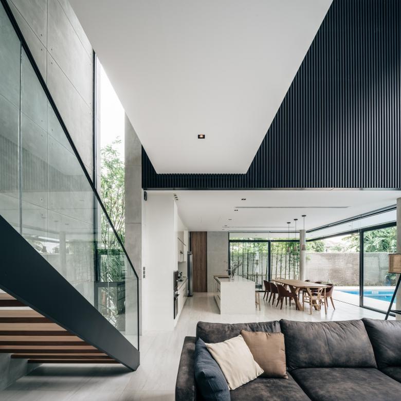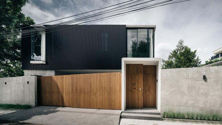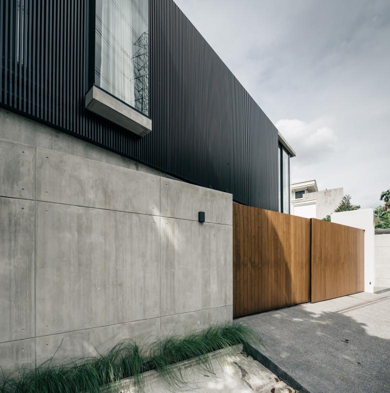 Black aluminum panels wrap the exterior wall to maximize the privacy while natural light and wind are still allowed to make their presence within the house.