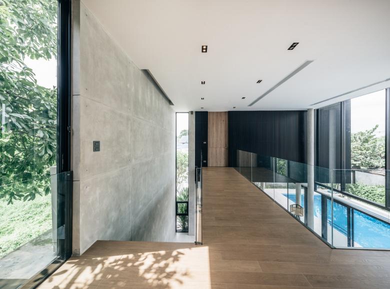 The two residences stand in a parallel orientation and are separated by a swimming pool, which exists as a part of the original residential program.