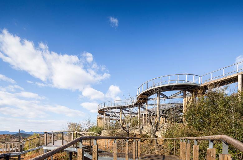 To soften the linear and squared spatial composition, the plank roads on the platforms were built following a soft curved design, creating meandering corridors with figures as soft as clouds in the sky. In this way, terraces, viewing platforms and wooden plank roads were integrated into a vast tour system, optimizing the interaction between space and landscape, while reflecting the design philosophy of "mutual creation between form and emptiness" used by the designer Zou Yingxi.