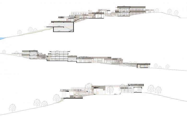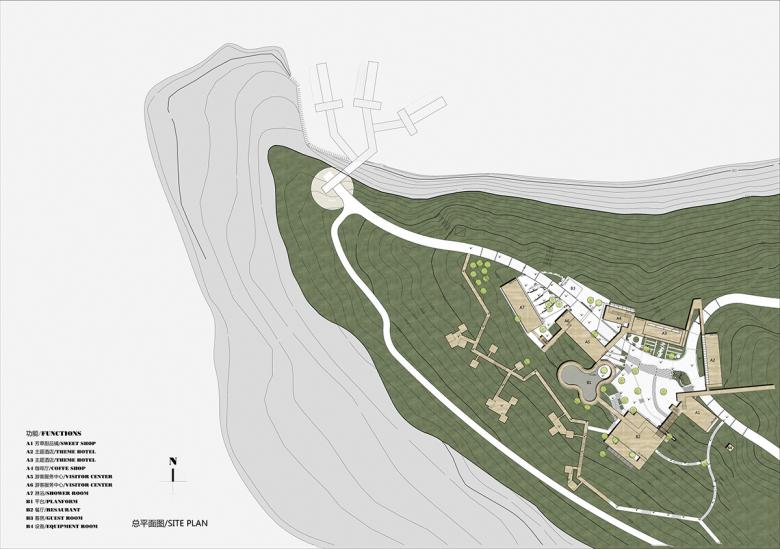 Before renovation, the layout of the project was scattered and lacked conceptual relevance. After SYN Architects took charge of the project, a fresh and logical concept was put into practice. Based on a three-sided perspective of the area surrounded by mountains and water, the designer decided to amplify the sensation of "natural wilderness" by creating an extensive 360° panoramic view effect. To produce an omnipresent and vast field of vision, the designer planted open rectangular terraces of different sizes with mountain-like features between the original structures, achieving both functional requirements and a new layout for the whole project. Furthermore, a landmark to the hotel was created halfway up the slope with the widest field of vision in the peninsula: a panoramic restaurant and a scenic glass platform that deliver a unique atmosphere created taking concepts from tourism and residence planning at the same time. The restaurant coexists in harmony with the surrounding vegetation, reaching towards the sky, while the viewing platform integrates perfectly into the natural tone of the whole building. Further still, its roof is set apart from other structures in the peninsula, as it allows sunlight to come in through, along with an unlimited 360° panoramic view.