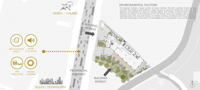 The site is hampered by noise from the provincial highway, air pollution, and concerns about employees and guests transiting to the office. There are easier solutions to address some of these problems but sustainable choices have to be made in 2020. The building was stacked to the back, hoping to create a focal point around the openness of the building's entrance. The building also has a large number of suspended elements, deep balconies, and sun visors. All of these components help to decrease the temperature inside the building. The windowed area in the west was reduced in size to decrease the energy usage from air conditioning. The windows along the front side were positioned in such a way that as the sun moves through the sky, a path of light can be seen moving through the office. This helps remind people in an office about the passage of time during the day.