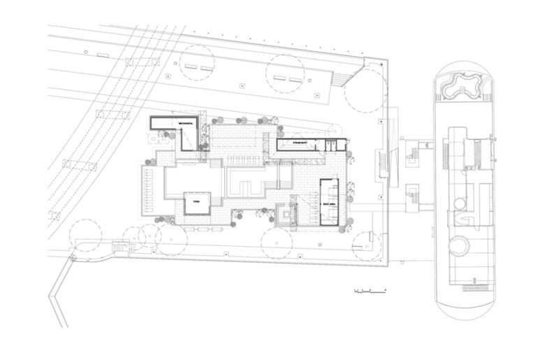 The first volumes greet and direct us to the center of the project. A ray of light draws us to the pool, the central element of the project. The containers thus revolve around this great body of water divided into three basins (cold bath, large hot tub and large pool). The orientation of these basins allows for a maximum of sunlight throughout the day and their irregular shapes generate different areas in order to maximize intimacy. Everything is spread out over a hundred feet and forms the largest non-public outdoor pool in Montreal.