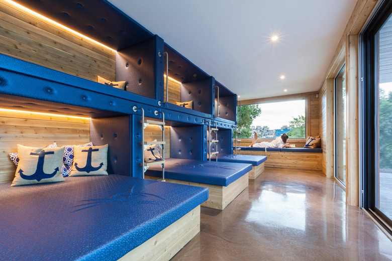 The idea behind the green roofs was to integrate the project into its environment and minimize heat gain. Although synthetic turf was laid temporarily, the impact of the green platforms views from the top of the boat is impressive and brings some discretion that piques our curiosity. Everything was prefabricated in a factory, disassembled and reassembled on site. Over the mechanical room, the roof becomes a waterfall that drops directly into the pool.