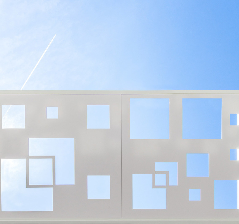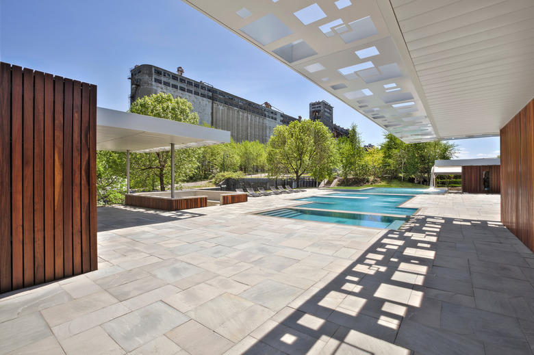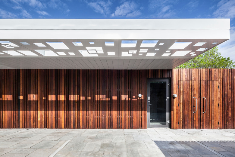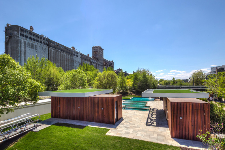 These "pavilions" were therefore arranged to create a course oriented towards relaxation and discovery. The architectural intention was to create a simple but yet elegant set of monolithic volumes that frames strong perspectives. The volumes are positioned in order to create continuous alignments with impressive views on the grain silos, Habitat 67, the Old Port and the skyscrapers of the city. Large green roofs cantilever to create sun animated shadows that help generate this oasis feel. Soffits of these roofs consist of large perforated metal sheets with a laser cut squares pattern that provides a set of shadows dancing to the rhythm of the movement of the sun.
