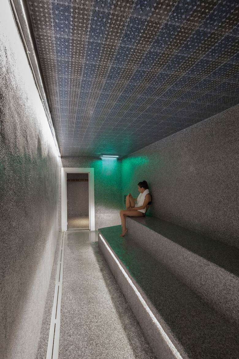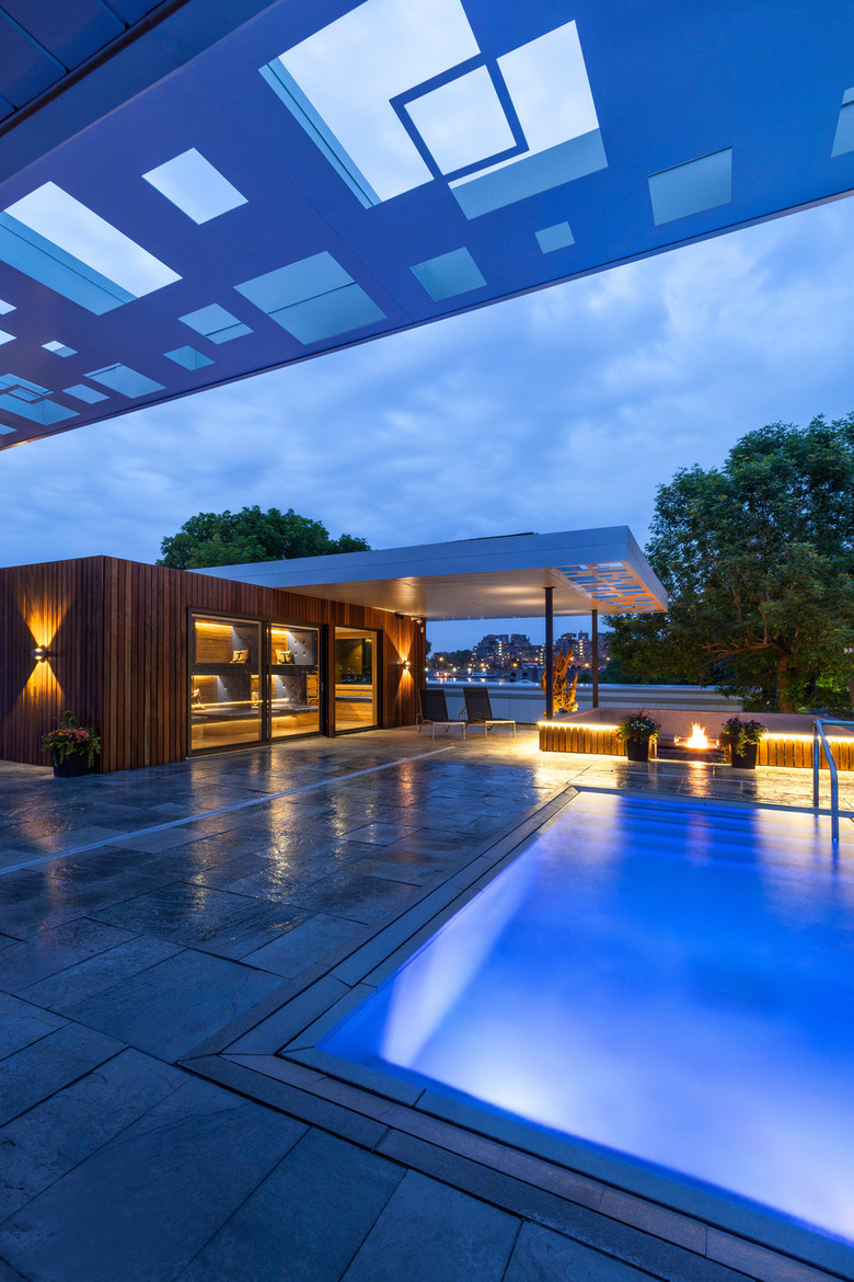 Surrounded by stone pathways, the pool is punctuated by rest areas, an outdoor fireplace and a yoga platform. It is thus possible to bask in a huge outdoor pool, in closed spaces to relax or take a sunbath under the tree canopies at the edge of the waterfall. The infinity pool overflow drainage system allows for total integration at ground level and provides certain spirituality. The place is a haven, an oasis of greenery and rest in the center of the city.