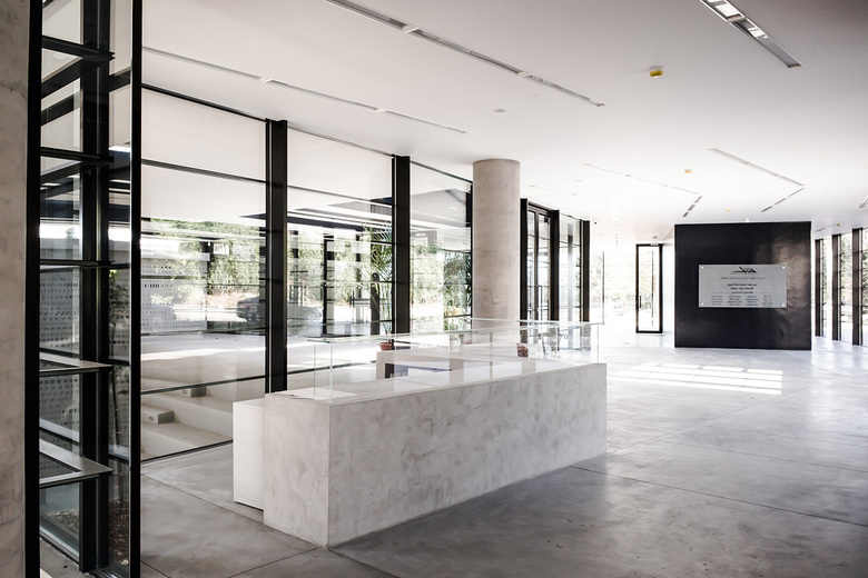 On the inner face of the lobby, a mural representing a geometric abstraction of the Phoenician alphabet introduces one of different forms of expression between art and calligraphy that the building’s architecture hosts.