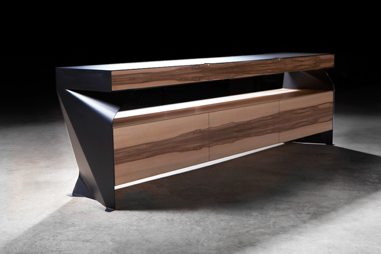 Moore + Friesl’s first stand-alone furniture piece intelligently designed by Marcus Friesl uses a single folded piece of thin sheet metal to support both upper- and lower-level wood drawers. The C1 Credenza represents Friesl’s belief that an ultra-contemporary furnishing using metal can have warmth and character, not necessarily be cold and uninviting.