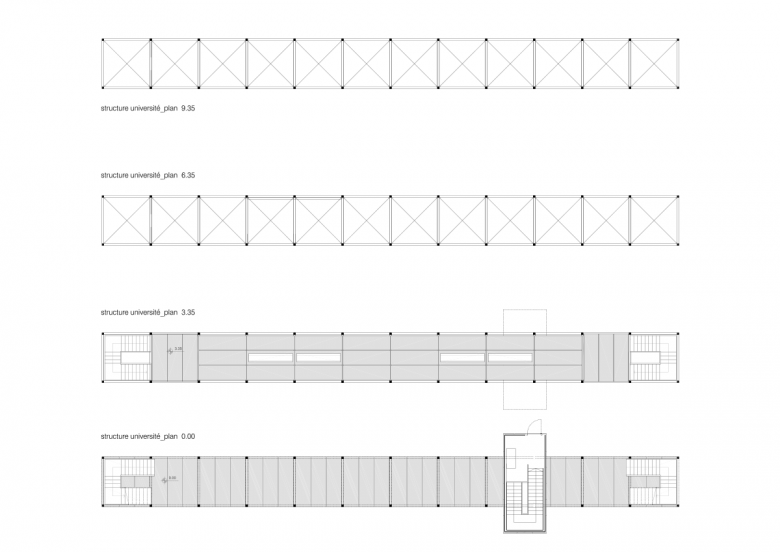 Though purposely spaced far apart, these structures are nevertheless connected to each other. Positioned along an extended axis crossing the site, or close to a building on piles, they are accessible from the periphery of the campus but also by passing through its interior. This dual approach is made possible thanks to the skillful work on their depths and their transparent upper sections encourage movement and mobility. They facilitate the conditions that encourage exchanges, which are often difficult to create on a university campus.