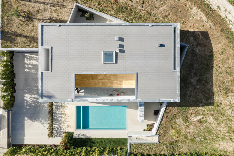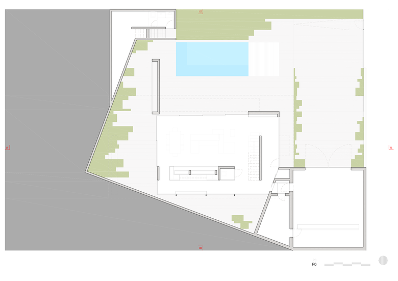 The containing wall, that starts in the outlines of the underground garage, maims the ground and ends at the outlines of the tangential limit of the swimming pool, and represents the rota:on of the volume in a negative way, located on the top of the latter. This monolith is coated in wood, with diagonal rulers, alluding to a mere nest that surrounds the private area of the house. Concrete and wood merge on a shade of grays, in a constant chroma:c mutation.