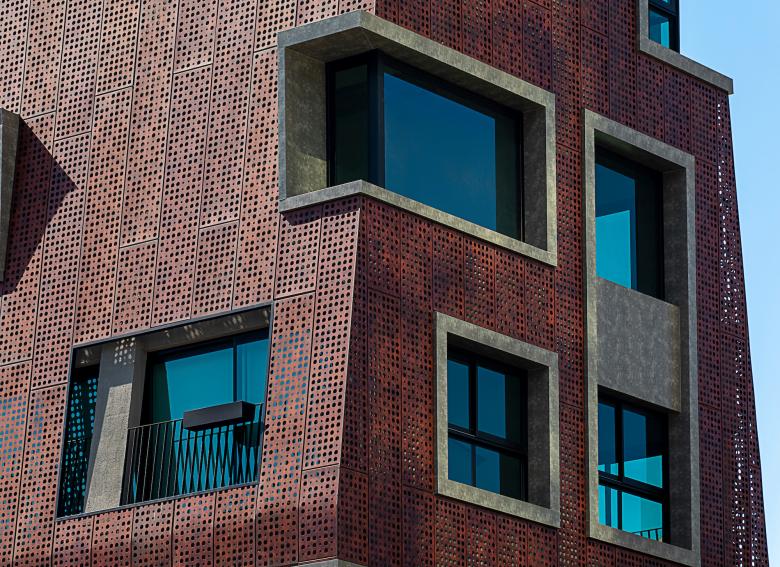 Finally, to ensure flatness on the facades, the sheets were bent on all four sides, thus increasing their rigidity. Although the sheets were randomly perforated, the joints were aligned and the volume was harmonious, several studies were carried out until the final fixing model produced an alignment of the slabs and the midpoint of each floor. The study ensured optimization in the secondary structure for fixing the plates: there are only three horizontal profiles per floor, and the upper and lower profiles were also combined to fix the plates of the adjacent floors.