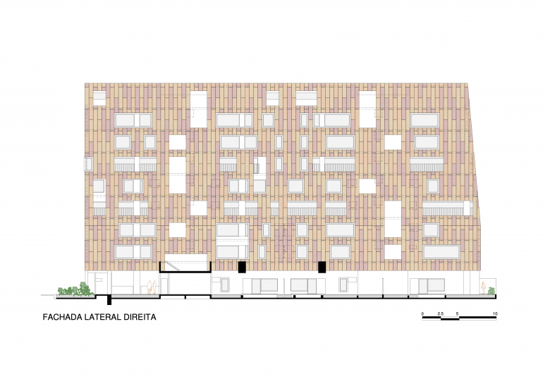 The building has 14 lofts and 24 studios, and is spread over nine floors in a construction located on a narrow lot, with a width of 12.7 meters. The challenge of its volumetric mathematics, to respect distances, was one of the factors that influenced non-obvious decisions resulting in architecture created with its own identity.