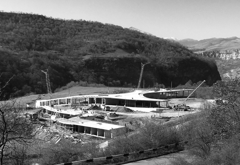 The currently under-construction Smart Center building is located in the north Armenian province of Lori. The structure’s organic form embraces the landscape by creating a sinuous ribbon like walkway creating a 7000 m2 courtyard. The one-story building is spread horizontally while following the topography of the site.