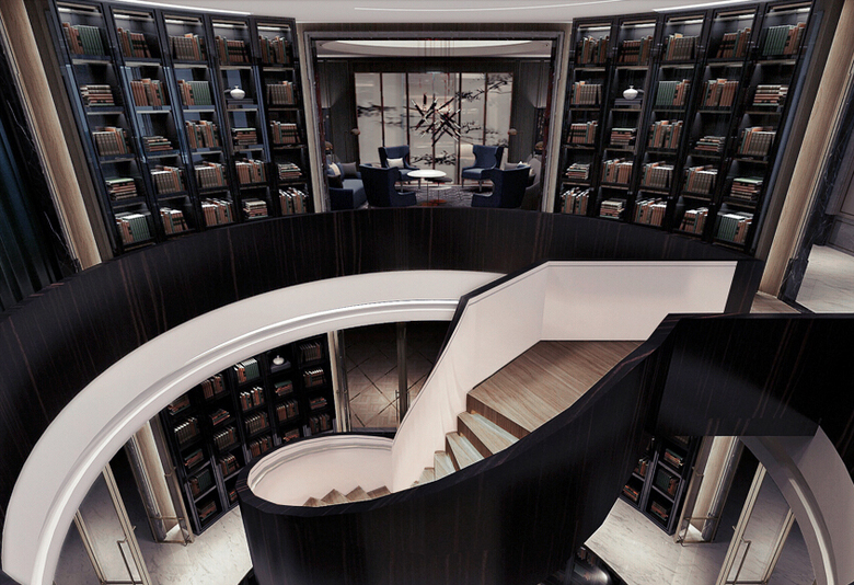 On the other side, the spiral staircase comes down to a second basement, conceived as a vertical library by the architect. A crystal-like water pond mirrors the surrounding book collections.