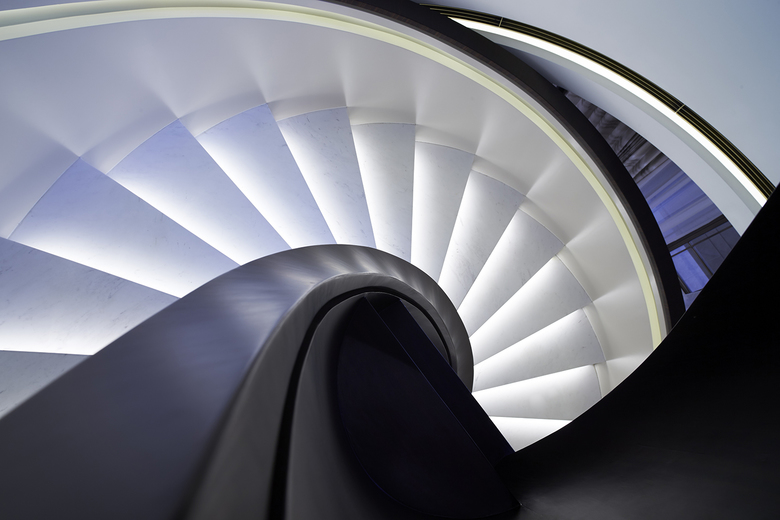 A beautifully erected staircase formed by circular shapes connects the second floor with the first basement. Here, the stillness of circular shapes and the movement of water current intertwine, not only as a structural symbol but as a spatial area that shapes up a unified relation from top to bottom, combining humanity, architecture and nature into one.