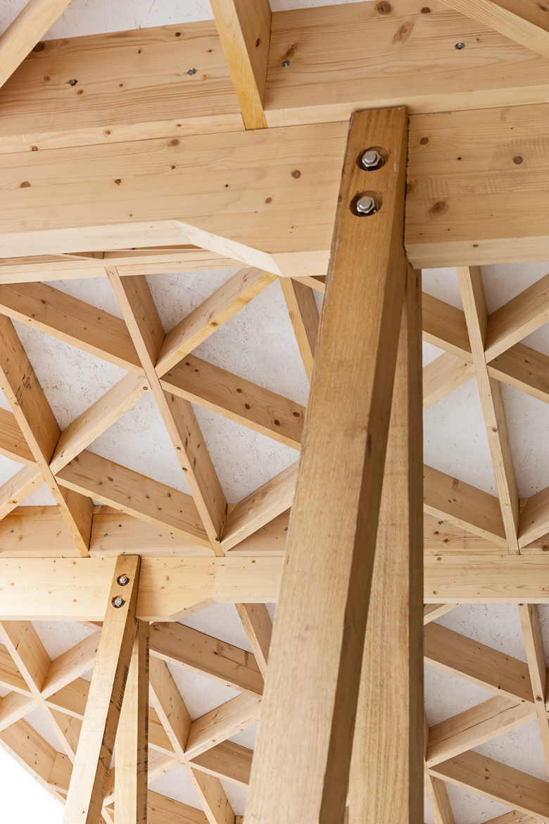 The structure is supported by a set of ten "quadrapods" – doubled A-frame supports -made from green oak.  These have a duel function, as each one incorporates bench seating or a table. These quadrapods carry the load of the canopy via glulam beams, which project form the roof to form a wing-shaped rain spout.
