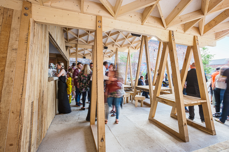 The courtyard garden is populated with green oak furniture, conceived as a set of tesselating components, and planted one-ton builders bags. These are easily movable, allowing the space to be reconfiguered to accommodate the rolling program of arts events, performances, cinema screenings and a market.