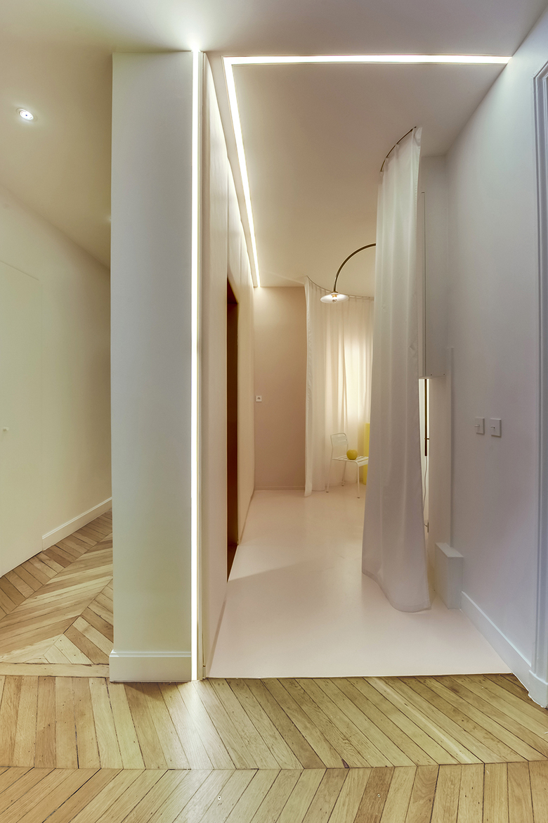The cabinet offers services of physiotherapy, osteopathy and lipomassage. The new created space is a felted interval of time between the street and the room dedicated to treatment. The skin but also the relation to clothing are notions which cannot be separated of the cares made in the cabinet. So this space of transition is going to be felt differently according to the patients: boudoir, cabin, niche, bedroom, vestibule...