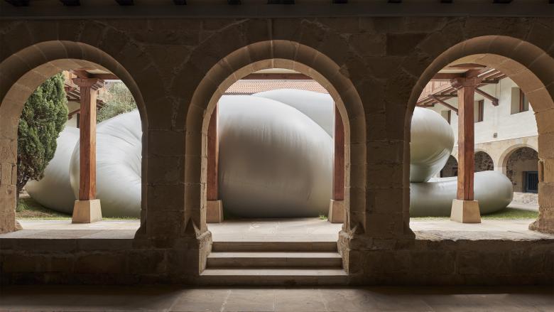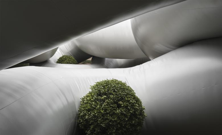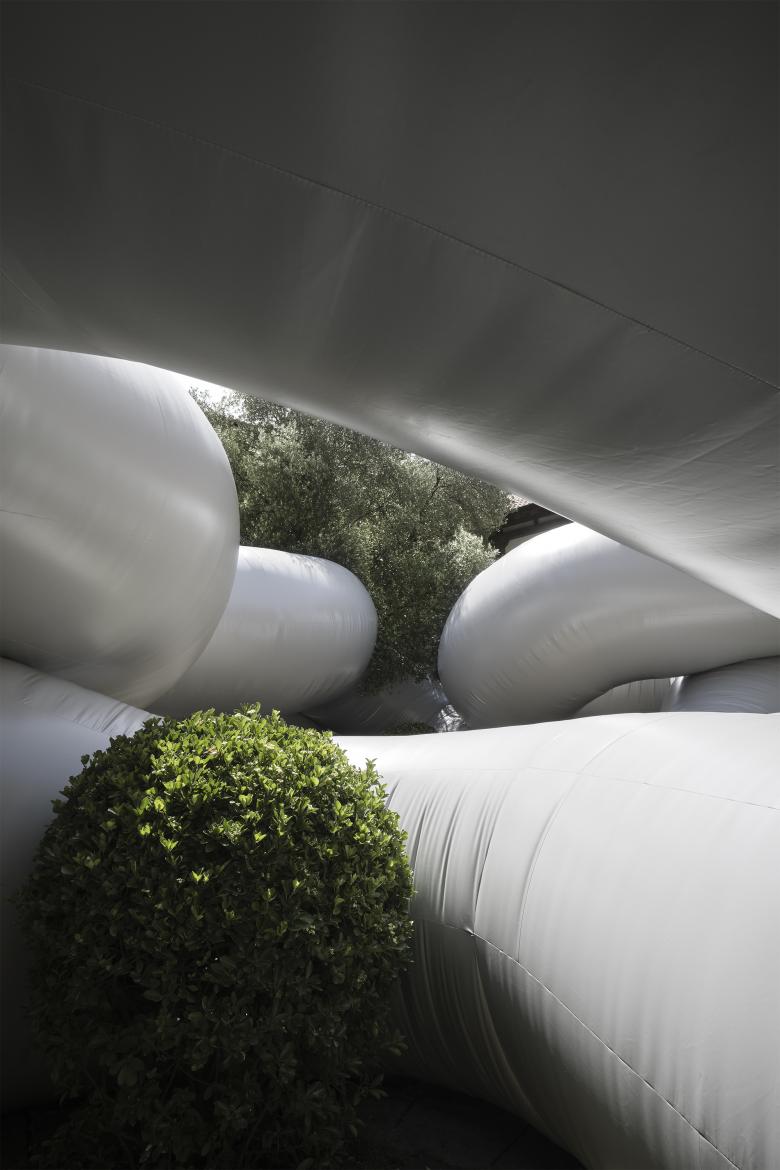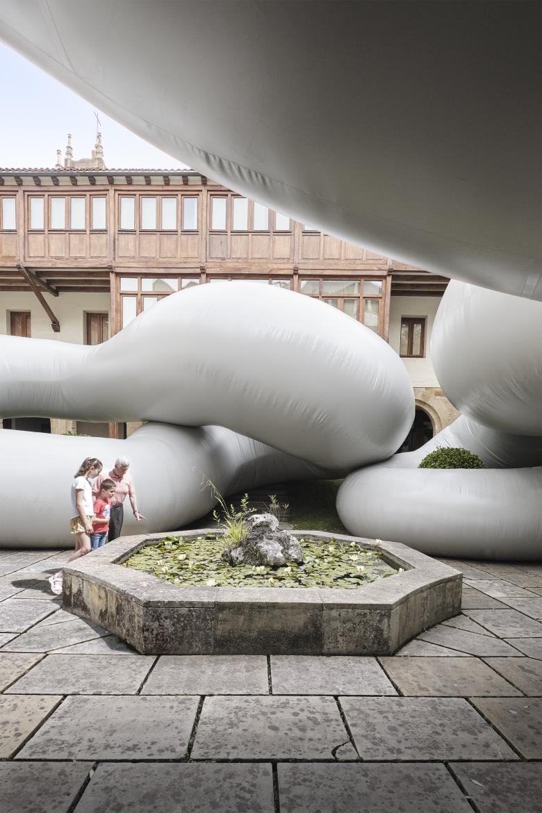 This new volume affects the cloister in a radical manner. Cuerpo Gris unfolds in space, winding between the elements of the garden around the lily fountain which remains as a central symbolic element. The inflated structure follows the main axes of the courtyard and its soft body is composed of three tangent pieces of variable diameters, which sum more than 120 meters of lineal length and reach a height up to 6 meters. Thanks to a detailed study of the site and a handcrafted production of the patronage, Cuerpo Gris adapts to the cloister’s topography. Rooted in the ground, it ties the boxwood bushes and absorbs the centenary olive tree in its twists.