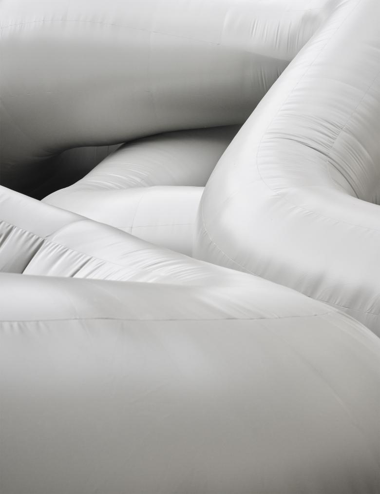 The experience of the atmosphere is materialized in a series of cavities proposing a fragmented vision of the space. The installation plays with the visitor: Cuerpo Gris alternatively immobilizes you, rolls you up softly in intimate spaces, expels you or invites you to straddle it. A monstrous corps that traps you in its interior and oppresses your gaze. The monumental appearance confronts the human body with a strange presence which is never revealed completely.
