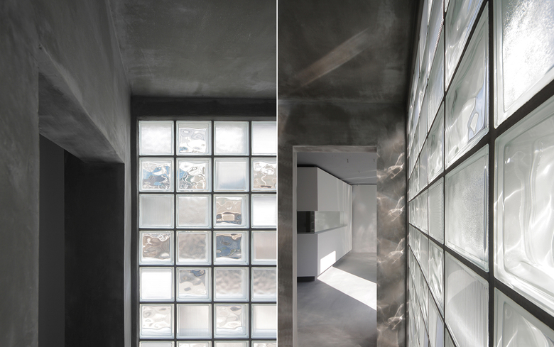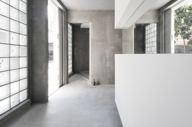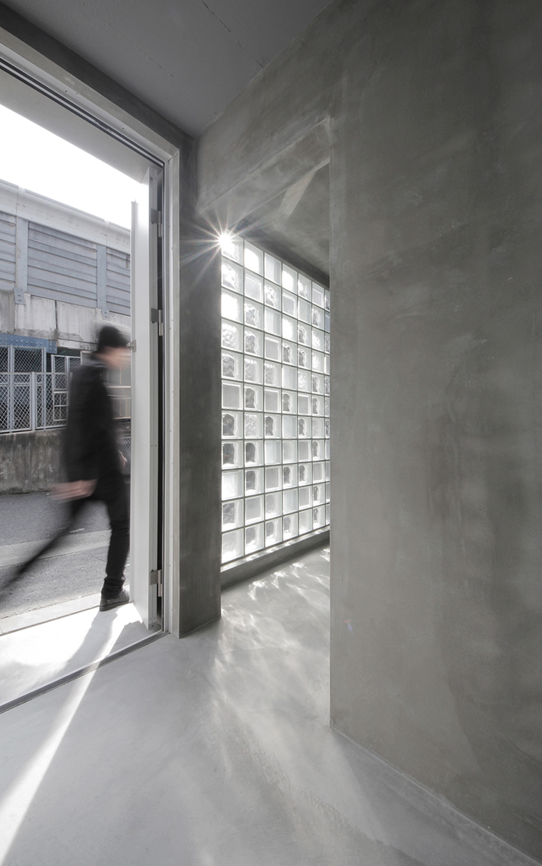 Easy maintenance as well as earthquake resistance, sound insulation and lighting were also satisfied, so square glass blocks was adopted in the facade on the 1st floor. Various glass blocks with opaqueness, translucency and wave patterns are arranged by a certain design rule. Lights and shadows colored vividly are brought to the simple interior space.