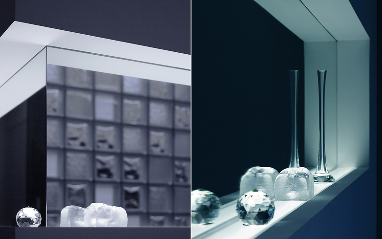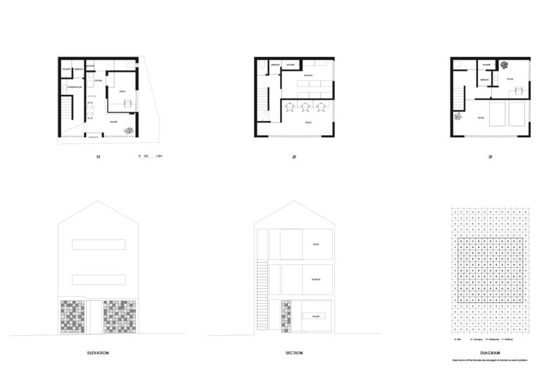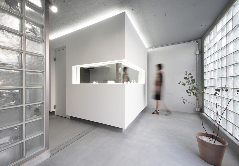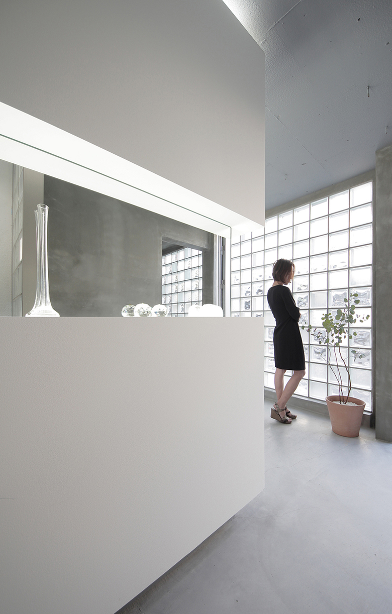 The first floor is divided into showroom, storage and sanitary. The client’s collection of glassware and antique is exhibited by a slit of the L-shaped thrust through in the wall of the storage core. The mirror surface in front of the slit inside makes various light be amplified, and the dim interior is produced softly.