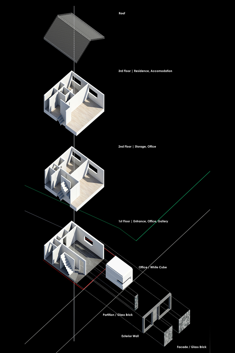 On the second floor, there are warehouses gathering antique collections, on the third floor, there is a private space for a comfortable stay. Indirect light in the upper part of a slit and a core illuminates the interior in the evening, and a gorgeous expression appears in the twilight and creates the scene like the crystal of glass. I expect that space in a played corner lot keeps being existence like only one little gleam as hope which shines on the darkness on which loneliness floats.