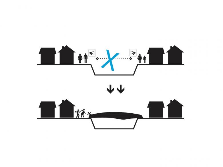This process reduces on-site installation time and greatly minimizes disruption to the surrounding community and impact on the creek habitat’s natural vegetation. Additionally, Alkanoglu paired the craned-in bridge with low impact piers on either side of the bank, and a rip-rap drainage system to create minimum footprints for the bridge foundation. “While stitching the urban neighborhood fabric back together, Drift also offers social and ecological opportunities for the local community through use of sustainable principles, which can alter our collective understanding of the built environment,” says Alkanoglu.