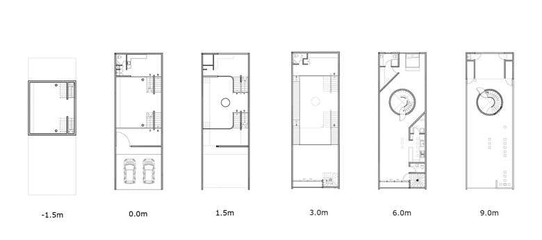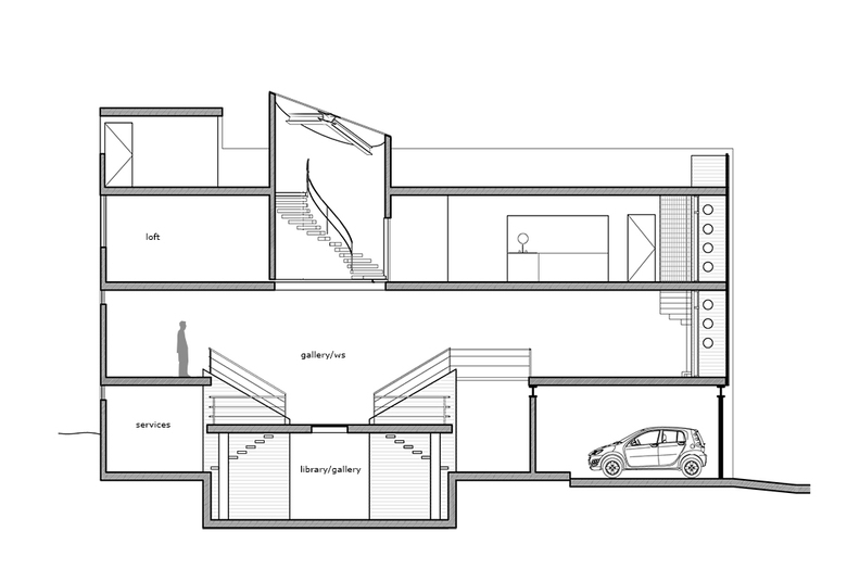 Interior walls were omitted and the building’s floor slabs were organized in half-levels such as Adolf Loos’ Raumplan. This strategy resulted in a collection of interconnected and illuminated spaces, which give a perception of total amplitude.